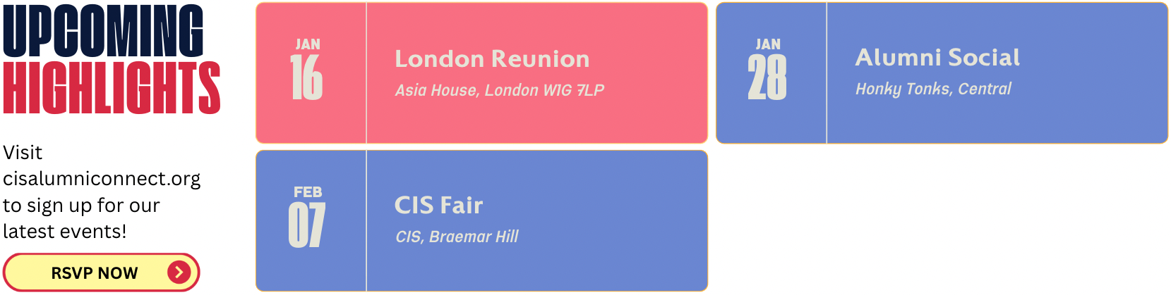 The CIS Alumni Board was formed in 2016 with the goal of strengthening pride, participation and commitment amongst alumni, this spirit encapsulated in our de facto motto “Connect, Inspire & Serve”.